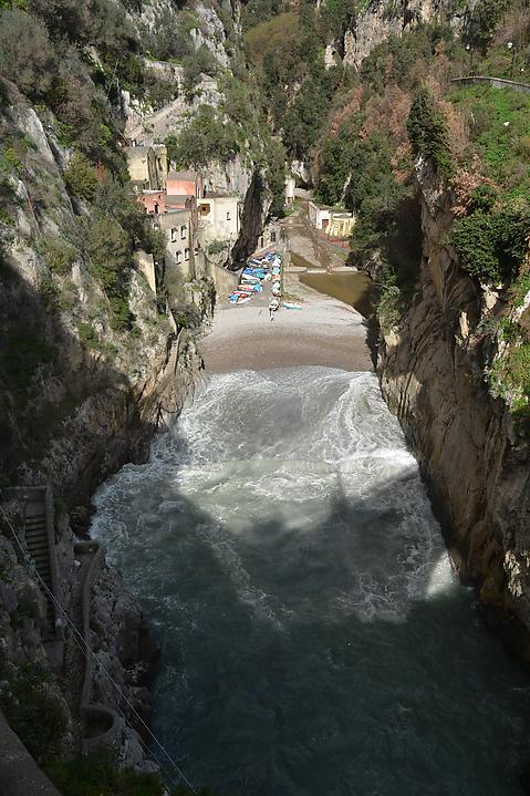 Furore – Pats miestelis šiuo tūžmingu pavadinimu yra visai mažytis. Tiesą sakant, aš darau didžiulę garbę šiam 700 žmonių kaimui vadindamas jį miesteliu. Ir vizitavimo priežastis yra netgi ne pats kaimas, bet taip vadinamasis Furore Fjordas. Tai yra vienas iš pačių italų vadinamų „paslėptų Amalfio pakarnatės perlų“ – na, dėl perlo aš tikrai nesiginčysiu, vieta įspūdinga. Tai yra, na, pats tikriausias fjordas – į kalnuotą, akmenėtą pakrantę giliai įsiterpusi siaura, lenkta įlanka. Vasarą tai yra vienas įspūdingiausių Kampanijos paplūdimių nepaisant to, kad krantas yra akmeningas ir jokio smėlio ten nerasite. Nepaisant to, siaura, lenkta forma garantuoja, kad fone net esant visai mažam bangavimui visada bus įspūdingų purslų bei fontanų. O štai dėl žodžio „paslėptas“ aš gan smarkiai pasiginčyčiau. Fjordas eina tiesiai po pagrindiniu pakrantės keliu – virš jo padarytas tiltas ir praktiškai visi, keliaujantys per pakrantę, pravažiuoja ir per fjordą. Matyt, paslaptis yra tame, kad važiuojant keliu fjordas prastai matosi ir reikia žinoti, kad jis toks yra. Priešingu atveju užteks dvi – tris sekundes nežiūrėti į reikiamą pusę ir viskas, fjordas pravažiuotas, ženklų, kad jis buvo ir galėjote jį aplankyti neberasta.