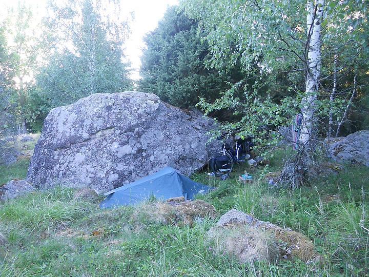 Rytą prisiminiau piemenėlių dainelę: „Saulala motula patekėk, patekėk; mes maži piemenėliai trumpi mūsų kailinėliai, mumi labai šalta…“ Užtat susikėliau ir susiruošiau anksčiau. Šiandien atidaviau duoklę švediškiems žvyrkeliams. Įsibėgėjęs kirtau geresnį kelią kuriuo ketinau važiuoti – per Osterbymo link Eksjo, o vėl nulindau į žvyrkelius – Tidersrum per Svinkult link Hjaltevad. Jo nedavažiavus apie 2km stojau nakvynės tokiame miške pilname mėlynių. Rytoj turiu pasiekti Vetlandą, gal bus dirbantis prekybcentris, nes atsargos baigėsi, o šiandien pakely nebuvo kur apsipirkti. Sunkoka diena tik palyginti nekaršta ir vėjas palankus (Nestiprus). Nuvažiavau 83km – 2059km