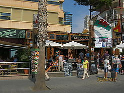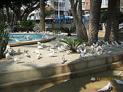 kuriuose nuo pat ryto apgėrę britai žiūri regbio rungtynes, kaip jau minėjau anksčiau, krepšiniu niekur net nekvepia. Kaip reikėtų suprasti, skirtingai negu kitose lankytose Ispanijos vietose, Benidorme ir apylinkėse susikalbėti angliškai jokių problemų. Dar labai įstrigo atmintin vienas skveras promenade pilnas baltų balandžių, jų ten turbūt tūksančiai vienoj vietoj, vaikšto, lesinėja, prausiasi fontane, atskrenda ir į pliažą, eina prie žmonių, drąsūs tokie.