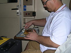 Na nežinau, jeigu čia prabangiausias, tai koks tada normalus? Kupe dvivietės, ir net turinčios kriauklę su vandeniu rankoms nusiplauti, bet tokios mažos, kad didesniam lagaminui pasidėti vietos beveik nebėra. Po gultu suradau kažkokias dvi keistos formos lentas, truputį riebaluotas. Kai paprašiau palydovo, kad susirinktų savo šiukšles, jis įkišo vieną lentos galą į sieną ir paaiškino, kad tai yra stalas, ant kurio reikės valgyti vakarienę. Atsisėdus prie tokio stalo, vietos bet kokiam pajudėjimui nebeliko visai. O vakarienei atnešė “mumijos mėsos”. Tiesa, tai buvo virta jautiena, bet kažkodėl beveik juodos spalvos. Pabaigai nusipirkom po mažaą skardinę vietinio alaus po 17 Egiptietiškų svarų. Alus neblogas, bet nutarėm geriau patuštinti savo atsargas ir daugiau neišlaidauti. Truputį pavakaroję ir su kitais bendrakeleiviais pasidalinę pirmaisiais įspūdžiais sugulėme miegoti…