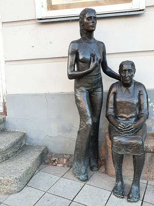 Šalia šio pastato sienos prisišliejusi skulptūra „Valstietės“, dvelkianti kartų skirtumais.