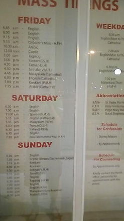 Vaizdas viduje kiek nuvilia – visgi šiuolaikinė netgi religinė architektūra nepasižymi formų ir papuošimų įvairove. Kas tikrai nustebina, tai mišių tvarkaraštis – šie renginiai vyksta ne tik anglų ar ispanų, bet ir malaylamo, koptų, korėjiečių, tagalogo, netgi arabų ir dar bala žino kokiomis kalbomis.