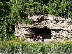 Plaukiam… Tarsi plūdurai, mūsų vandens kelią dešinėje ženklina Latvijos valstybinės sienos stulpeliai, o kairėjė – mūsų Lietuvėlės ženklai. Nemunėlio upė visiškai nepriminė vakarykščio slalomo per „pievas“ ir „riedulynus“, todėl plačiais irklų mostais sparčiai „balsavome“ Latvijos link. Lietuvos pusėje savo grožiu atsivėrė Nemunėlio dolomitinės atodangos arba tiksliau Velniapilio (Padvariečių) uola. Prieš atsisveikindami su Lietuvėlės žemėmis stabtelėjome Germaniškio gyvenvietėje. Čia sutikome labai griežtą lietuvį, per kurio žemę norėjome tik praeiti. Mūsų vadovo Vaidoto karinga stovėsena ir raudona kepuraitė iššaukė supykusio žmogelio grasinimų „susipažinti“ su kalašnikovu… Numalšinę aistras, draugiškai susitarėme, kad mes nevietiniai gražiai praeisime. Liūdna, kai mūsų upių ir ežerų pakrantės, kaip karo metais vis labiau patenka i privačių rankų „apsuptį“. Kitapus Nemunėlio, ant stataus šlaito išdidžiai stovėjo šimtametė Skaistkalnio gimnazija, kuri, kaip sužinojome, dar ir dabar turi savo orkestrą.