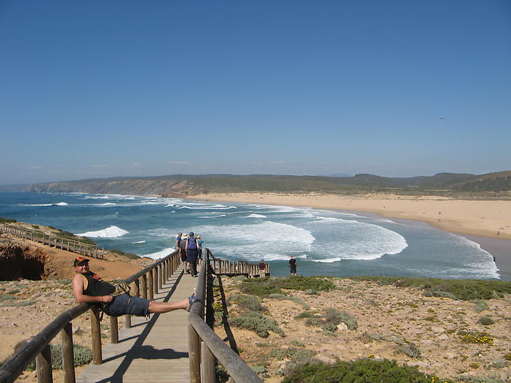 Pliažas buvo beveik tuščias, poilsiautojų mažai. Manau, kaltas dar nepakankamai įšilęs vanduo. Bet kokiu atveju, vieta tikrai verta dėmesio, nes čia yra ne tik fainas paplūdimys, bet ir labai gražios apžvalgos aikštelės, kuriose galima mėgautis nepakartojamais Atlanto peizažais. Vaizdingu pakrantės takeliu pėsčiomis įmanoma nueiti iki už 5 km esančio pliažo Praia do Amado (37°10’06.9″N 8°54’03.8″W). Tai aktualu tiems, kas mėgsta ilgus pasivaikščiojimus, o mes į šį pliažą nuvažiavome su mašina, nes negalėjome tiek laiko skirti pėsčiųjų žygiui. Praia do Amado mums pasirodė tikru banglentininkų rojumi.