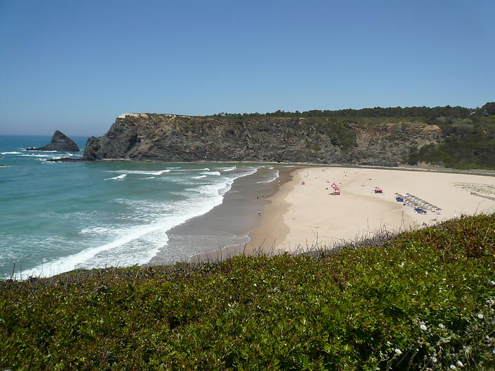 Čia ilgai neužsibuvome ir nuvažiavome į pliažą Praia de Odeceixe (37°26’26.0″N 8°47’54.9″W). Tai didelis, platus smėlėtas pliažas, kurio ypatumas tas, kad paplūdimį supa upė.