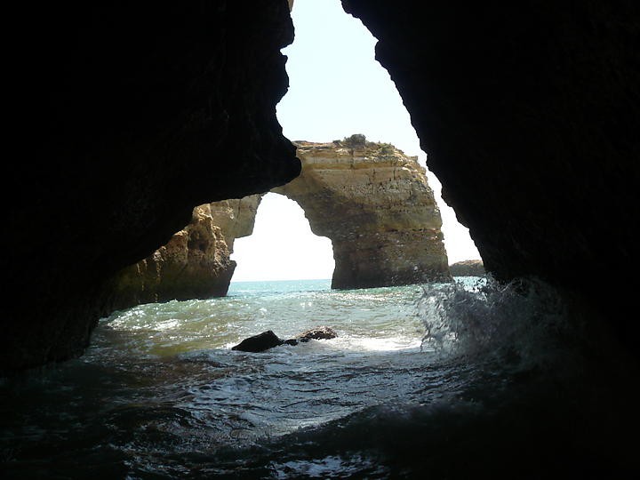 Esmė yra tame, kad į grotą galima patekti tik vandeniu, į jį reikia įplaukti. Kitokiu būdu ola nepasiekiama. Aišku, galima pro angą virve nusileisti į grotą, bet tai jau alpinistiniai reikalai, be to, niekas taip daryti neleistų. Vietiniai verslininkai organizuoja iš paplūdimio apžvalgines ekskursijas motorinėmis valtimis (30 min. 15 Eur žmogui). Yra ilgesnių ir prabangesnių ekskursijų. Taip pat galima išsinuomoti irklalentę ir su ja nuplaukti iki žymiojo groto. Su irklalente išplaukti į atvirus vandenis gana problematiška dėl intensyvios bangų mūšos. Problematiška, bet įmanoma: jei ne iš pirmo, tai iš kažkelinto karto tikrai pavyks įveikti bangas ir nutolti nuo kranto. Visi nori patekti į vaizdingąjį grotą Algar de Benagil. Jei plauksi su laiveliu, tai grote neišlipsi ir po jį nepasivaikščiosi, nes dėl tų pačių bangų sudėtinga tiek prisišvartuoti krante, tiek ir išplaukti. Todėl turistai valtelėmis įplaukia į groto vidų, nufotografuoja ir varo atgal. Mes pasirinkome patį įdomiausią, originaliausią, bet ir ekstremaliausią būdą – šokome į vandenyną ir plaukte nuplaukėme savo jėgomis į grotą. Giedrė nelabai moka plaukti, todėl liko pliaže saugoti daiktų ir nervuotis dėl mūsų. Ką aš galiu pasakyti – avantiūra pavojinga, bet atrakcija superinė. Jei pasitikite savo jėgomis ir mokate plaukti, būtinai išmėginkite šį varijantą. Grotas iš vidaus tikrai nuostabus, bet ir pats plaukimo į jį procesas ne ką mažiau jaudinantis ir suteikiantis daug adrenalino. Stovint veidu į Atlantą, grotas yra kairėje pusėje iš karto už uolos posūkio. Taigi, trise įbridome į bauginantį vandenyną ir ėmėme plaukti tikslo link. Yrėmės rankomis lėtai, neskubėdami, nenutoldami vienas kito. Grėbliuoti buvo ne taip paprasta, nes srovės darė savo darbą, o bangos kilnojo aukštyn žemyn. Apėmė įdomus jausmas, kai supratau, kad esu nutolęs nuo kranto ir likęs akis į akį su neramiu Atlantu. Kuris kurį įveiks? Gana sėkmingai per kokias 10 minučių apiplaukėme uolą ir pasiekėme grotą. Jo viduje išlipome į smėlėtą pakrantę ir supratome, kad esame atskirti nuo viso likusio pasaulio: juk atgal grįžti reikės tokiu pačiu šlapiuoju būdu…Viduje mus pasitiko įspūdinga uždara erdvė su skyle skliaute, pro kurią švietė saulė. Krantas nusėtas gausybe gražių didelių kriauklių. Tokių plaukikų kaip ir mes viduje radome visą kompaniją. Vieni vaikštinėjo ir rinko kriaukles, kiti gulėjo ant smėlio, o treti šildėsi po anga ir gaudė saulės spindulius. Aš truputį drebėjau, nes sušalau vandenyje, todėl irgi šildžiausi ir stebėjau valtimis plaukiojančius turistus. Jie su pavydu žvelgė į mus iš savo laivelių, nes jiems išlipti į krantą neleidžiama. Vienintelis pliusas, kad jie galėjo nufotografuoti grotą iš vidaus, o mes, dėl suprantamų priežasčių, to padaryti negalėjome. Nieko tokio, šis nepakartojamas vaizdas giliai įsirėžė man į pasąmonę ir išliks visam laikui be jokio fotoaparato. Pasimėgavome grotu, pailsėjome, sušilome ir nėrėme atgal į bangas. Atgalinę misiją vykdyti sekėsi kur kas lengviau, nes žinojau, kur plaukti, kiek plaukti ir kaip. Pasikinkėme bangas, pasinaudojome srovėmis ir neskubėdami parplaukėme į pliažą. Išlipę į krantą pasidalinome įspūdžiais su Giedre ir dar ilgai džiaugėmės, kad ryžomės šiai avantiūrai ir ją sėkmingai įgyvendinome. Paplūdimyje atgavome jėgas, pasišildėme saulutėje, o netrukus jau sėdėjome automobilyje ir važiavome atgal į Lagos. Viešbutyje pavakarieniavome, prigriebėme vyno ir su Ramune nuėjome į šalia esantį pliažą Praia Dona Ana (37°05’28.8″N 8°40’12.4″W). Ten atsigulėme ant gultų ir su puikiu vaizdu į Ponta da Piedade nuleidome saulę. Vynas lengvai svaigino, vakarėjantis paplūdimys ir gražiai ošiantis vanduo padėjo pilnai atsipalaiduoti, panirti į lengvą transo būseną ir suguldyti į stalčiukus visus puikiai praleistos dienos įspūdžius.