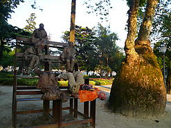 Tai yra svarbus pastebėjimas, nes Portugalijoje mačiau nedaug šviesių viduje bažnyčių. Dauguma jų viduje yra tamsios, jautiesi ten tokioje prieblandoje. Yra sakoma: prie tamsos daugiau drąsos, bet šiuo atveju toks posakis visai netinkamas ir nepriimtinas. Juk čia ne koks nors naktinis klubas. Leistis žemyn buvo kur kas smagiau. Žengėme laiptais į kalvos apačią su trumpais stabtelėjimais, pasižvalgymais ir pasifotkinimais. Atrakcija man patiko, tikrai verta dėmesio. Laiptai susisiekia su labai simpatiška alėja, skirta pėstiesiems. Laiptai ir alėja kažkaip harmoningai susilieja ir pereina vienas į kitą, sukurdami vientisumo įspūdį. Čia jaukiai galima pasėdėti medelių pavėsyje ant suoliukų šalia fontanų ir pagalvoti apie egzistencijos subtilybes. Juokauju, aišku. Velniop tas filosofijas, skrandis gurgia reikia įsimesti maisto. Centre esančioje kavinukėje išgėrėme kavos, užkrimtome pyragėlių, akyse prašvietėjo, galima tęsti pažintį su Lamego.