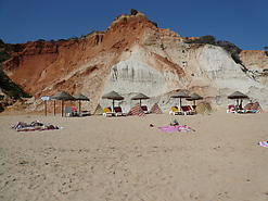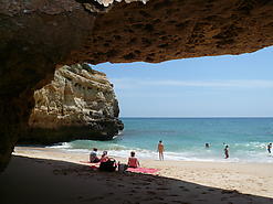 Automobilį palikome didelėje aikštelėje viršuje, o į paplūdimį nusileidome pėsčiomis. Tai ne itin didelis smėlėtas pliažas, iš visų pusių apsuptas aukštų ir stačiai kylančių uolų. Pliažas garsus ola (grotu) Algar de Benagil su milžiniškais skliautais ir apvalia anga į dangų.