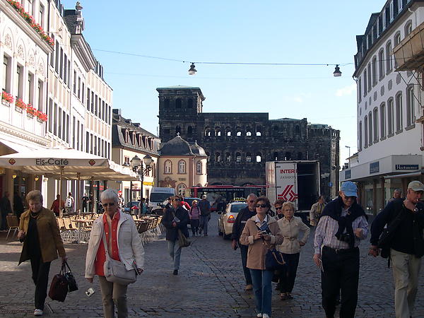Taigi, pasistatę mašiniuką praėjom keletą kvartalų iki Porta Nigra. Statinys tikrai įspūdingo dydžio ir spalvos. Tai vieninteliai iš 4 išlikę miesto vartai, o išliko jie tik todėl, kad viduramžiais buvo paversti bažnyčia ir ten palaidotas atsiskyrėlis vienuolis Simeonas. Kiek teko matyti išlikusiu Romos Imperijos laikų statinių, visi jie panašūs ar tai būtų Romos Koliziejus, ar Pulos amfiteatras ar Porta Nigra, skiriasi tik paskirtis, o statybinės medžiagos ir architektūra tokia pati, bent jau man, kaip nespecialistui. Praėję pro vartus patekom į didelę aikštę, kurioje jau buvo bepradedą rinktis turistai, bet kol kas dar negausiai. Iškart užbėgom į TIC pasiėmėm miesto planelį su pažymėtais maršrutais ir lankytinom vietom. Greitai susidarėm maršrutą ir pradėjom miesto tyrinėjimą. Pirmiausiai patekom į turgaus aikštę, laikoma viena gražiausių Vokietijoje, nors aš, tiesą sakant, nieko įpatingo ten nepamačiau, graži miesto aikštė, apsupta gražių namų, viduryje vyksta prekyba, pagrinde vaisiais. Kitas sutiktas objektas – Domus (Šv. Petro Katedra – seniausia Katedra Vokietijoje), ją pastatė tas pats imperatorius Konstantinas 326 m., ir buvo ji tuo laiku 4 kartus didesnė negu dabar, nors ir dabar pakankamai didelė. Paprastai retai einam į tokių statinių vidų, šį kartą taip padarėm ir ne veltui. Jeigu sakytum, kad viduje gražu, tai nieko nepasakytum, viduje tiesiog gera būti, todėl ir vaikščiojom gana ilgai, klausėmės vargonų, nulipom į rūsius, uždegėm po žvakę, vaikščioti ir žiūrėti galima bet kur, fotografuoti ir filmuoti taip pat. Gaila, kad buvo uždarytas Katedros iždas su ten esančiom krikščioniškojo pasaulio relikvijom, tokiom, kaip vinis, kuria prie kryžiaus buvo prikaltas Kristus, apštalo Andriaus sandalas ir t.t., kurios buvo pradėtos kaupti Triere imperatoriaus Konstantino motinos Helenos, bet net ir be to , Katedra paliko labai stiprų įspūdį, net man, nekrikščioniui. Išėję dar elgetai palikom 1 eurą, kad sektųsi. Toliau praėjom pro Aula Palatina arba Konstantino baziliką. Pastatas statytas 310 m., jame buvo Konstantino sosto salė, dabar protestantų bažnyčia. Netrukus patekom prie Kurfiursto rūmų, laikomų vienais gražiausių barokinių rūmų pasaulyje, su nedideliu, bet gražiai sutvarkytu parku, kur sėdėjo daug įvairių mergaičių ir paišė tuos rūmus, piešimo pamoka ekskursijoje, turbūt. Tiesa, rūmų lankymas galimas tik pagal išankstinį susitarimą. Už parko jau ir kitas gabaliukas išlikusios miesto sienos, perėjom visą senamiestį skersai, ir Romos pirčių griuvėsiai, nelabai įspūdingi, bet objektas. Išėję iš senamiesčio, patraukėm per gyvenamųjų namų rajoną, nes norėjom aplankyti amfiteatrą ir pamatėm Vokietijai visai nebūdingą vaizdelį – šaligatvis prie gyvenamųjų namų visas, kiek ilgas, užverstas šiukšlių maišais. Ir matosi, kad jie čia jau ne pirmą dieną guli – praplyšę kai kurie, ir šiukšlės nerūšiuotos. Gal koks šiukšliavežių streikas buvo, taip ir nesupratom.