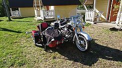 Kitas kempingo kaimynas senelis su anūku keliaujantys Harley-Davidson motociklu su lopšeliu. Puikus transportas.